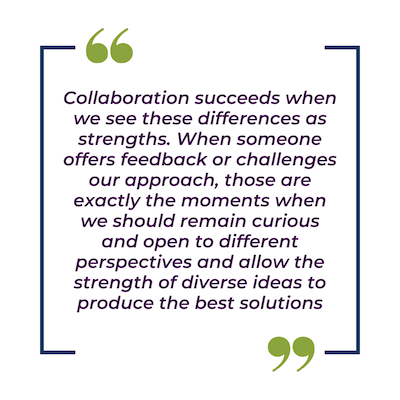 Collaboration often breaks down when we dig our heels in and prioritize our own agenda over shared learning. Others’ perspectives are quickly dismissed, often with the assumption that their approach is wrong or misinformed. Yet collaboration succeeds when we see these differences as strengths. When someone offers feedback or challenges our approach, those are exactly the moments when we should remain curious and open to different perspectives and allow the strength of diverse ideas to produce the best solutions.